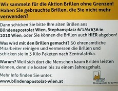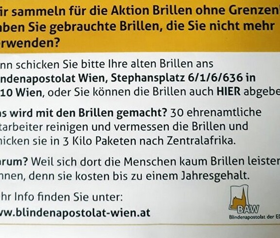 Im Zeitraum vom 4. November bis zum 4. Dezember möchten wir darum bitten, alte Brillen, welche nicht mehr benötigt werden, im Sekretariat der Schule, Seegasse 30, 1090 Wien, 2. Stock, abzugeben.